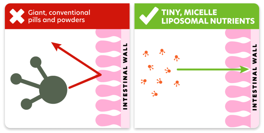 Our patented micelle liposomal delivery system protects the vitamins from the acid in your stomach, allowing them to pass through your digestive system fully intact. They then shield and shuttle the nutrient to your intestinal wall, where it can be readily absorbed into your bloodstream.